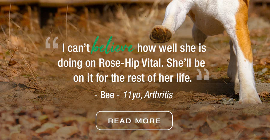 Rose-Hip Vital® Canine is a plant-based anti-inflammatory and immune system support for your dog's joint health and general wellbeing. Made from Rosehips manufactured with patented processes, Rose-Hip Vital® Canine is scientifically and clinically proven to reduce inflammation, protect cartilage, improve general health and improve performance.