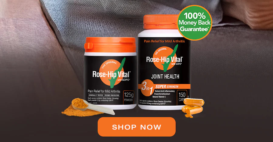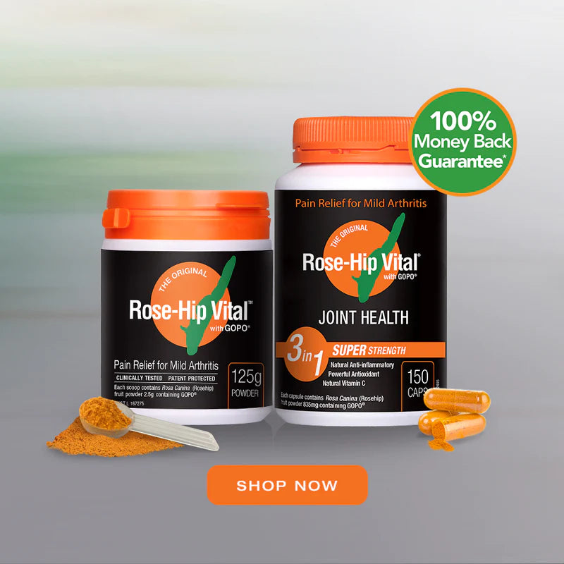 Rose-Hip Vital® with GOPO® is a plant-based anti-inflammatory and immune system support for joint health and general wellbeing. Made from Rosehips manufactured with patented extraction and drying processes, it’s a scientifically and clinically tested natural anti-inflammatory, antioxidant and natural vitamin C used to relieve and prevent joint pain, stiffness, inflammation and swelling associated with mild arthritis.