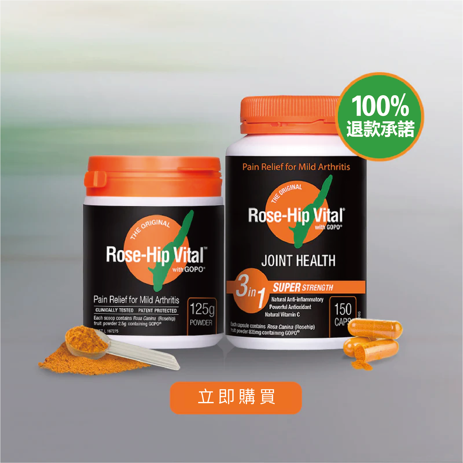 Rose-Hip Vital® with GOPO® 是一款全天然純植物製劑,具備抗炎和改善免疫系統的作用,可促進關節健康和整體健康。它由採用專利提取和乾燥工藝製造的玫瑰果製成,是一種經過科學和臨床測試的天然抗炎劑、抗氧化劑和天然維生素 C,用於緩解和預防與輕度關節炎相關的關節疼痛、僵硬、炎症和腫脹。
